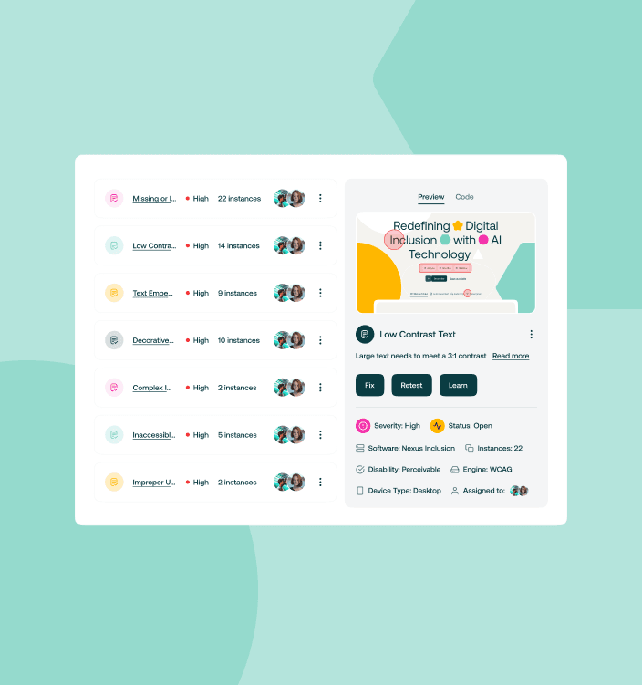 With Nexus Inclusion’s complete suite of scans and tools, you can enhance site performance, and achieve accessibility compliance across your digital content.